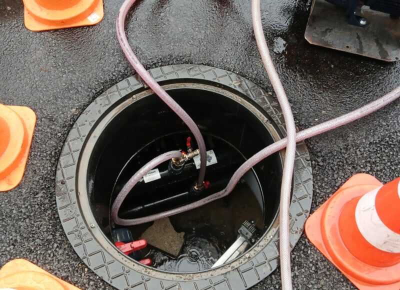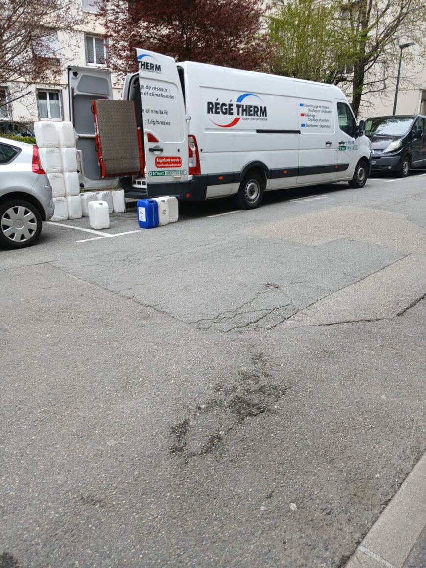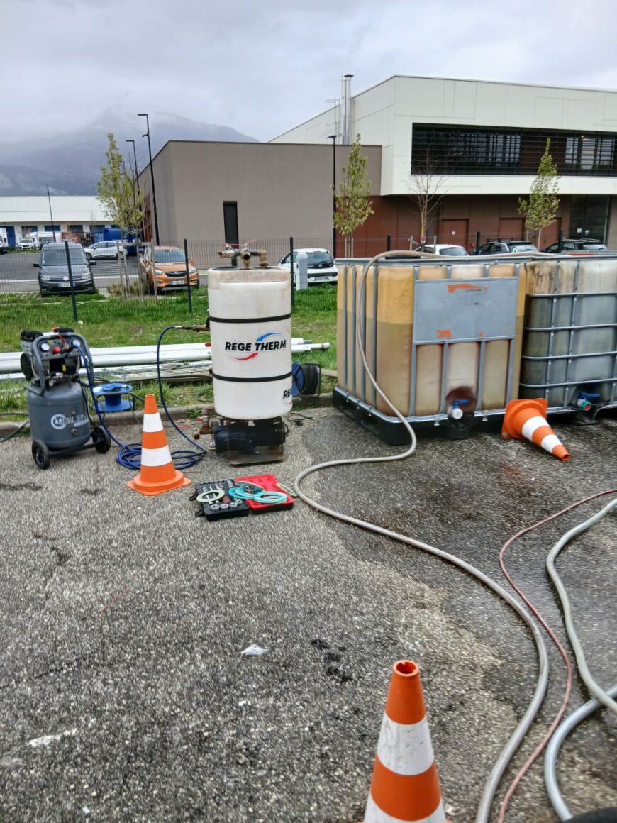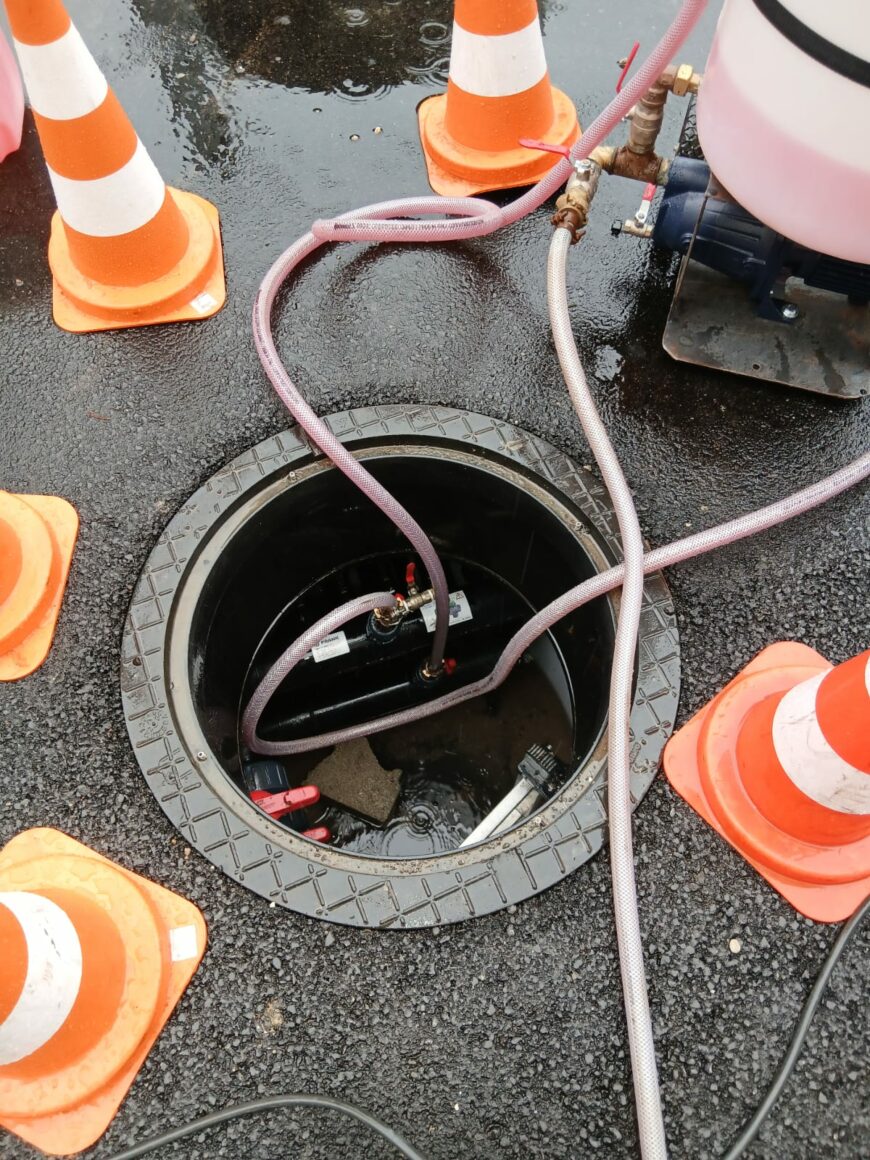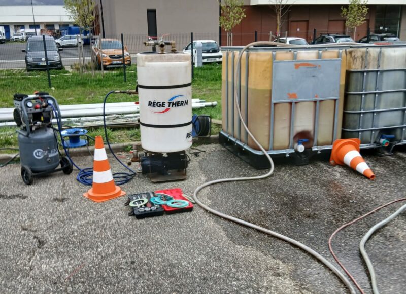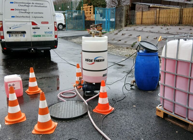 - Rinçage à l’eau, à minima 3 fois le volume du réseau ;